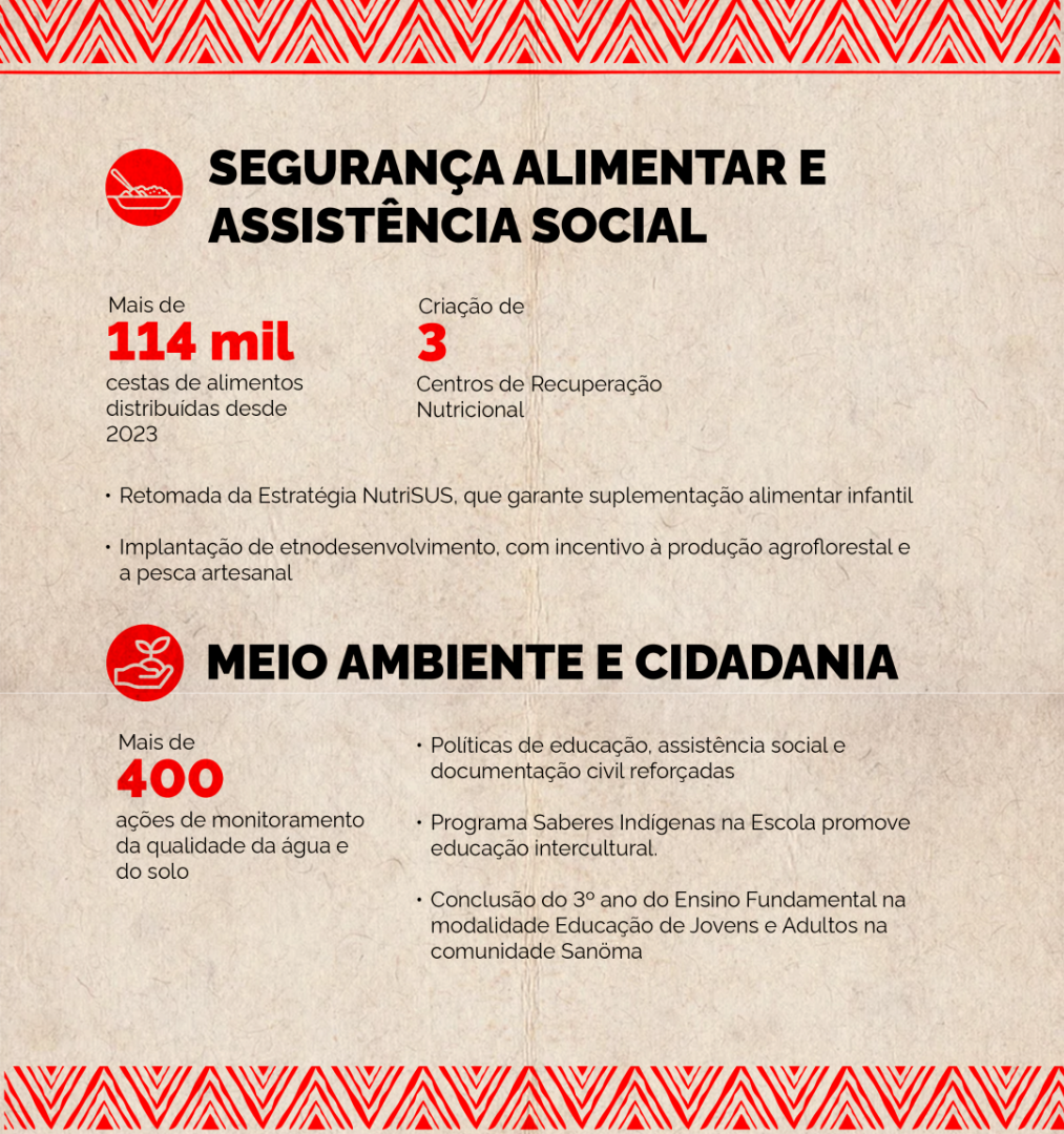 Além disso, foram criados três Centros de Recuperação Nutricional e retomada a estratégia NutriSUS, garantindo suplementação alimentar infantil. Projetos de etnodesenvolvimento também foram implementados, incentivando a produção agroflorestal com a retomada das roças tradicionais e da pesca artesanal.