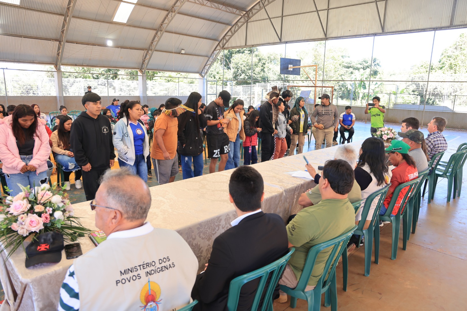 Os representantes das instituições que assinaram o Termo de Ajustamento de Conduta foram recebidos na Escola Estadual Cacique Gregório Kaekchot com danças e cantos tradicionais pelos estudantes e lideranças indígenas da comunidade.