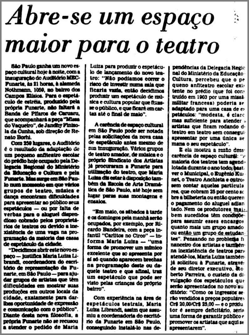 Eu fui para a FUNARTE em 79, quando da inauguração da Sala Guiomar Novaes. A Maria Luiza Librandi era Coordenadora, nomeada pelo (Roberto) Parreira. Estava precisando de trabalho, liguei para ela, que me respondeu: “Estou precisando de alguém para administrar o espaço”, e eu fui para lá. E, de fato, eu acho que foi o melhor trabalho que fiz na minha vida. Fiquei 16 anos na Funarte… Momentos muito bons, outros terríveis. Éramos uma equipe bem reduzida (…). Assim que eu cheguei eram só duas pessoas. Era a Lulu e a Telma Monteiro, secretária pessoal dela. E, logo depois, a Lulu contratou um casal: o Paulo Roberto, que era o nosso porteiro, elegantérimo, e a Marta, na época, mulher dele, que era a nossa bilheteira. Ela está lá até hoje. Eu não lembro quando o Bicelli foi pra lá. (Trecho de entrevista concedida por Myrian Christofani a Ester Moreira e Sharine Melo em 04/08/2016).