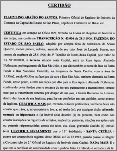 Certidão de compra do terreno de Dona Sebastiana de Souza Queiróz pela Fazenda do Estado de São Paulo, em 1906. Fonte: Primeiro Oficial de Registro de Imóveis Flauzilino Araújo dos Santos.