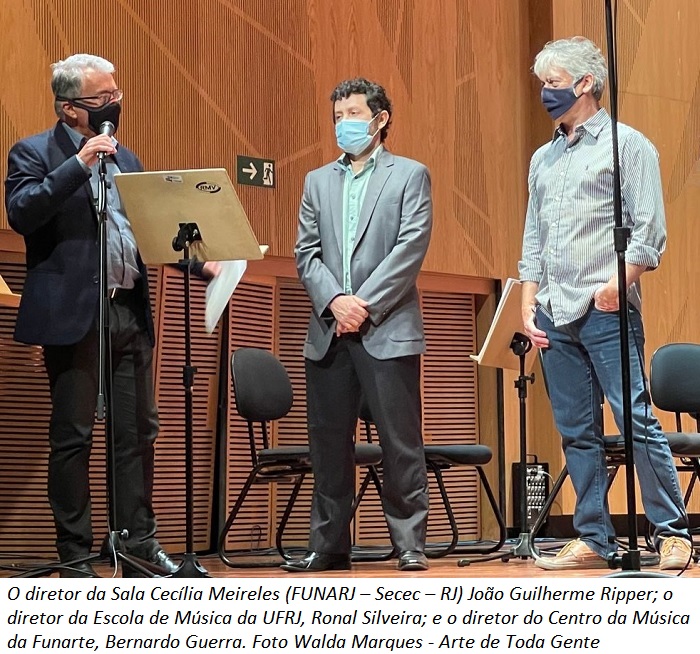 - João Guilherme Ripper, diretor da Sala Cecília Meireles – FUNARJ – Secec – RJ; o diretor da Escola de Música da UFRJ, Ronal Silveira; e o diretor do Centro da Música da Funarte, Bernardo Guerra. Foto Walda Marques