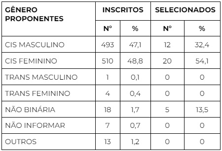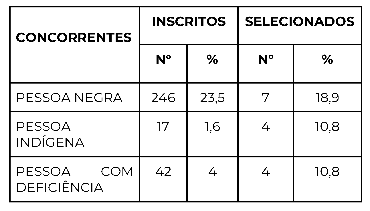 A ação afirmativa de reserva de recursos é destinada aos Concorrentes relacionados no projeto, portanto, ao indivíduo ou coletivo que executará a proposta e que se autodeclara(m) pessoa(s) negra(s), indígena(s) e com deficiência, conforme previsto no item 6 do edital. Do total de 1.046 inscrições, 35 (29,2 %) projetos optaram por concorrer nessa modalidade, sendo: 246 (23,5 %) por pessoas negras, 42 (4 %) por pessoas com deficiência, 17 (1,6 %) por pessoas indígenas.