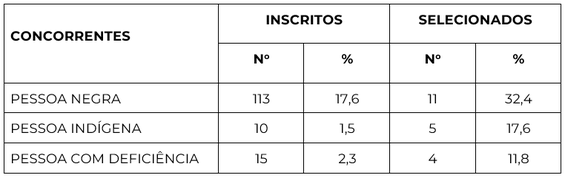 A ação afirmativa de reserva de recursos está destinada aos Proponentes com quadro societário composto por maioria que se autodeclara(m) pessoa(s) negra(s), indígena(s) e com deficiência, conforme previsto no item 6 do edital. Do total de 639 inscrições, 125 (19,6%) projetos optaram por concorrer nessa modalidade, sendo: 102 (16,0%) por pessoas negras, 7 (1,1 %) por pessoas com deficiência, 6 por pessoas negras e com deficiência, 5 (0,8%) por pessoas indígenas e 2 por pessoas negras/indigenas e com deficiência.