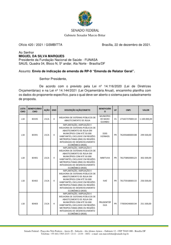 | 84 | Of. n. 457/20/GDN , de 18/12/2020 | 4784770 | 922729 | Sistema de Abastecimento de Agua MARUARU | 2021 | MUNICIPIO DE CURRALINHO | PA | 31/12/2024 | 250.014,00 | VIGENTE |