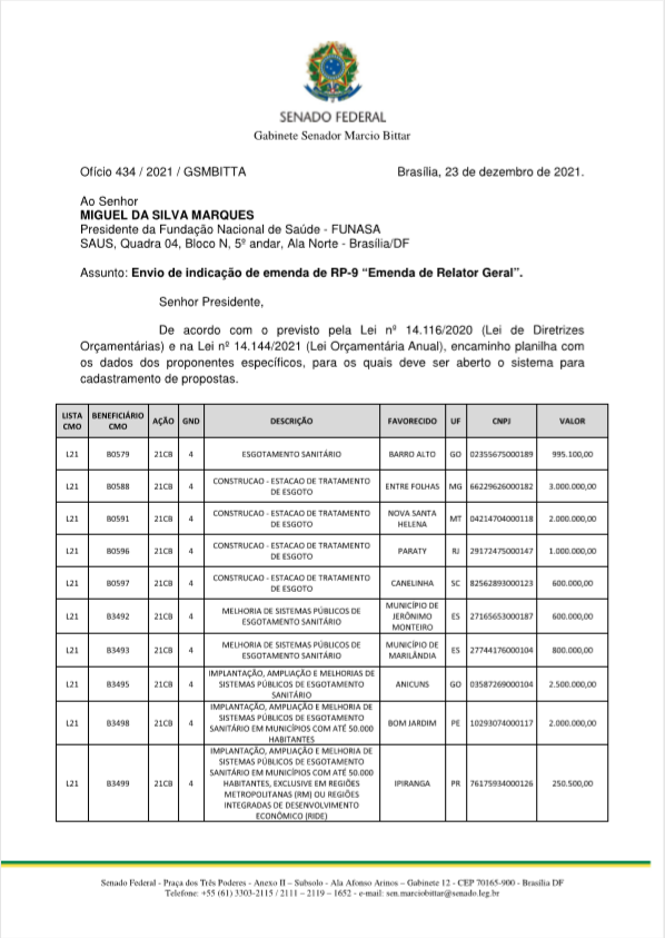 | 23 | Of. n. 502/2021/GSMBITTA, de 29/12/2021 | 4784783 | 932403 | IMPLANTAÇÃO DE SISTEMA DE ESGOTAMENTO SANITÁRIO NO MUNICÍPIO DE IRAUÇUBA-CE | 2022 | MUNICIPIO DE IRAUCUBA | CE | 28/07/2025 | 5.000.000,00 | VIGENTE |