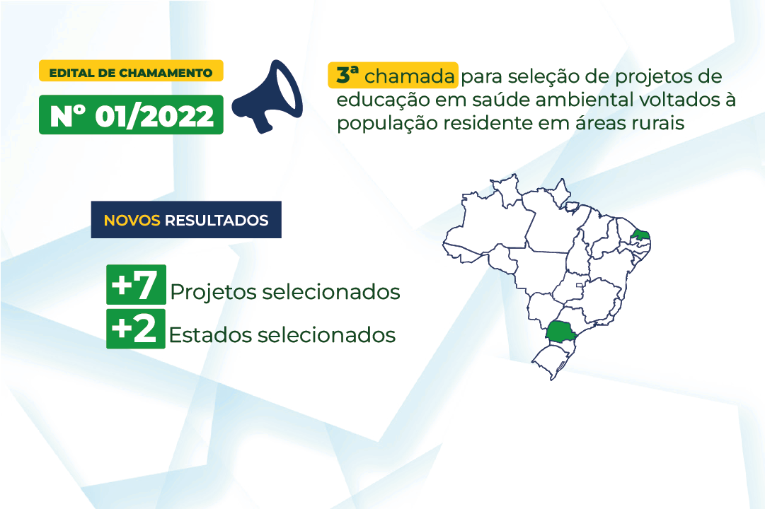 Nesta quarta-feira (28/12), a Fundação Nacional de Saúde (Funasa) publicou, no Diário Oficial da União (D.O.U), a terceira chama do Edital de Chamamento nº 01/2022. O documento, que divulga outros sete municípios contemplados com recursos da instituição, busca contribuir com a melhoria da qualidade de vida nas comunidades rurais e tradicionais das localidades contempladas a partir de ações ligadas a proteção da saúde, a sustentabilidade e aos serviços de saneamento e de saúde ambiental.