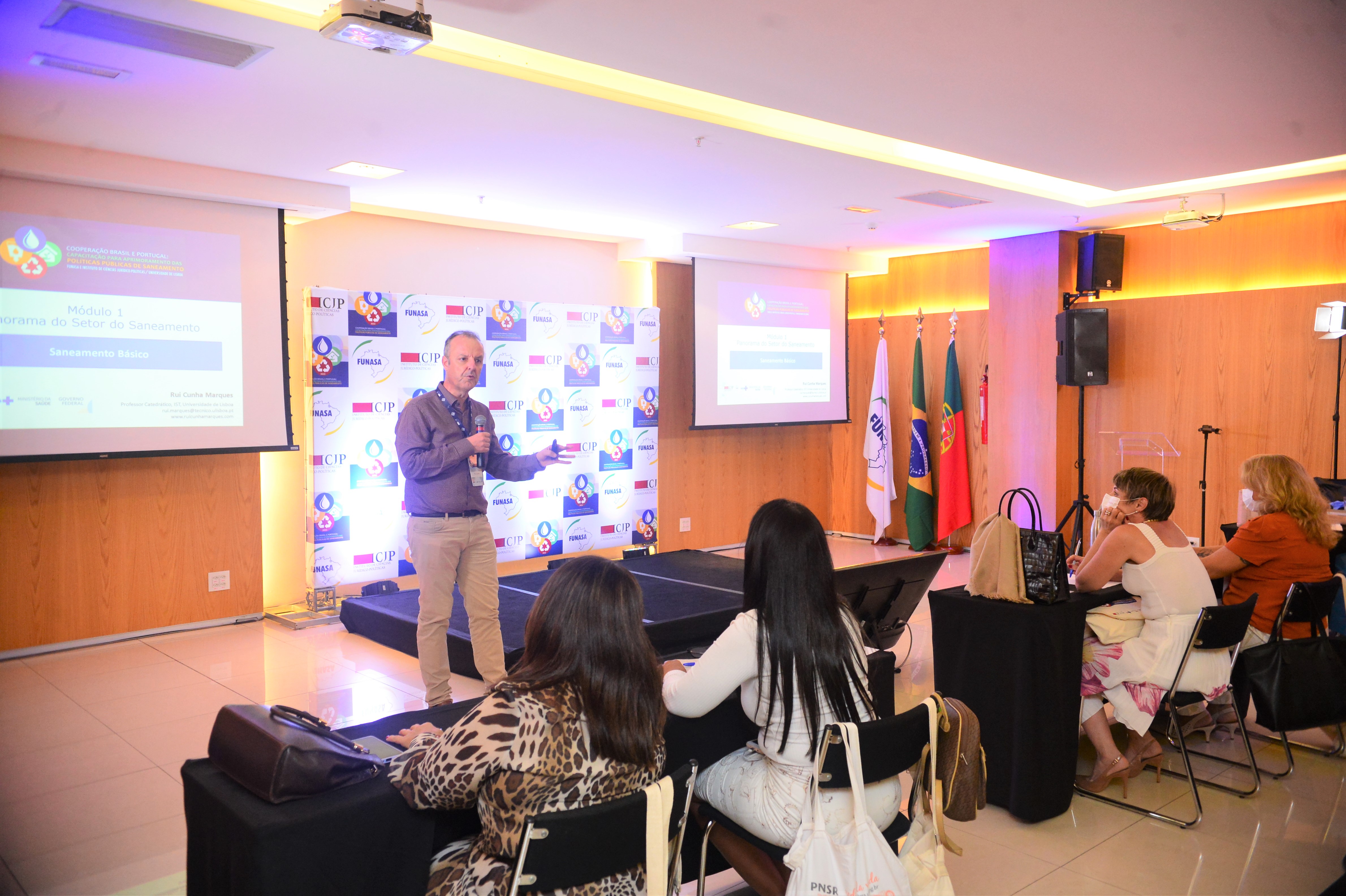 A primeira aula do curso foi ministrada pelo professor doutor do ICJP, Rui Cunha Marques, que explicou aos membros de várias Superintendências Estaduais da Funasa (Suest) sobre o panorama do setor do saneamento, a caracterização dos serviços de saneamento, os aspectos técnicos e sua difusão, dentre outros assuntos. Além de discutir sobre ações finalísticas, o docente também falou sobre o planejamento, sendo ele o primeiro ponto a ser observado quando se pensar em saneamento.