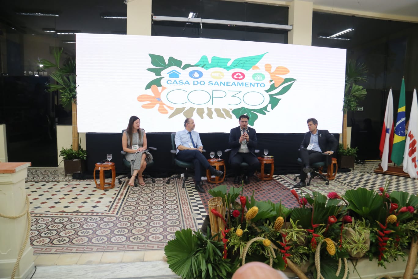 O terceiro painel da abertura da Casa do Saneamento, nesta terça-feira (30/9), em Belém (PA), reforçou o esforço do governo federal em articular políticas intersetoriais, integrar municípios de menor porte e populações vulneráveis, além de combinar financiamento público e privado para ampliar a universalização do saneamento básico e aumentar a resiliência diante da crise climática. O presidente da Fundação Nacional da Saúde (Funasa), Alexandre Motta, moderou a discussão, com participação do secretário nacional de Meio Ambiente Urbano, Recursos Hídricos e Qualidade Ambiental do Ministério do Meio Ambiente, Adalberto Maluf, da coordenadora-geral do Marco Legal do Saneamento do Ministério das Cidades, Patrícia Valéria Vaz Areal, e do superintendente adjunto de Regulação de Saneamento Básico da Agência Nacional de Águas e Saneamento Básico (ANA), Alexandre Anderáos.