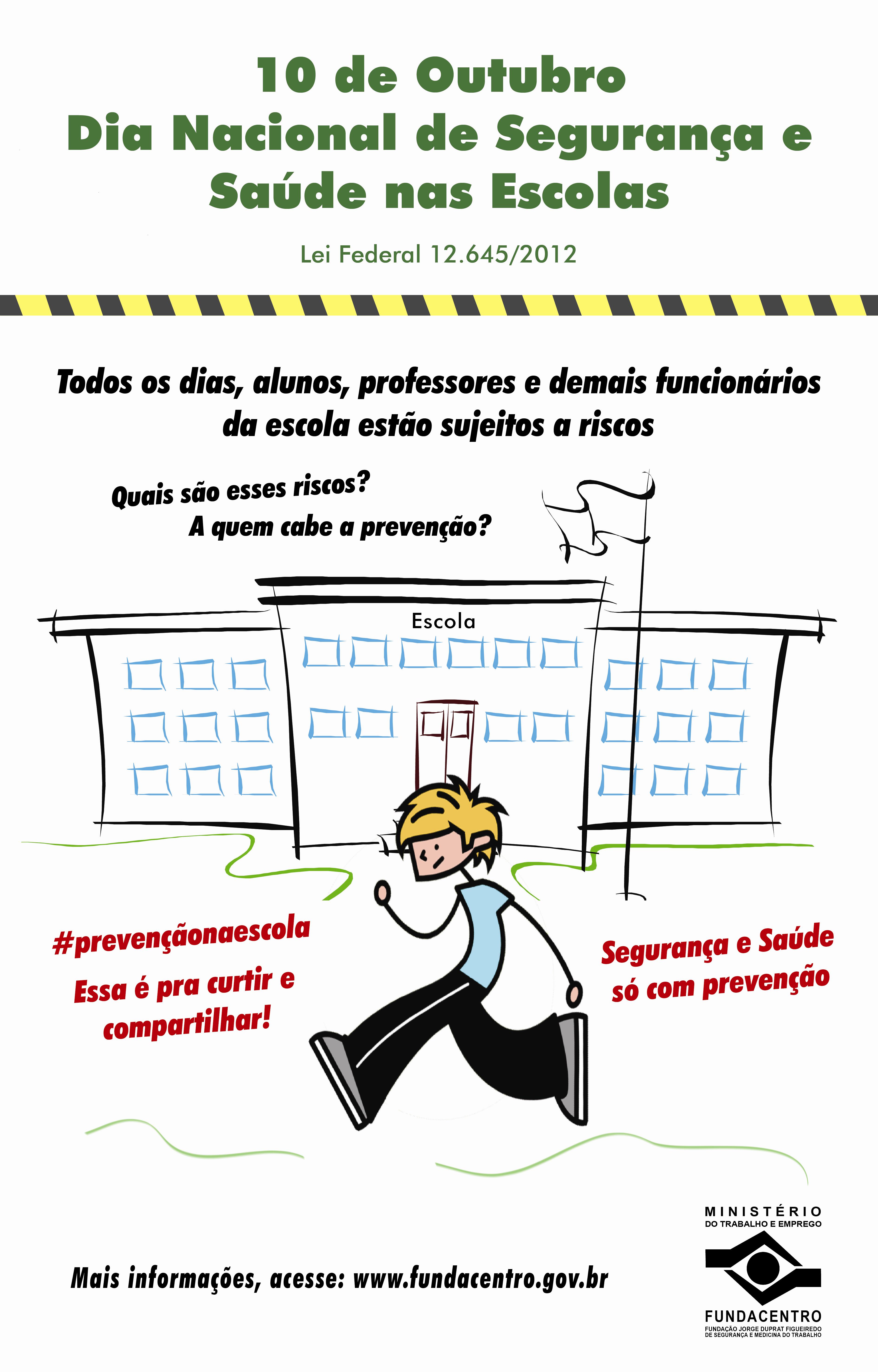 A Fundacentro elaborou um cartaz e uma cartilha sobre o tema, estruturada em mensagem aos professores, mensagem aos alunos e uma atividade “Trilha da Saúde e Segurança”, disponível para download abaixo: