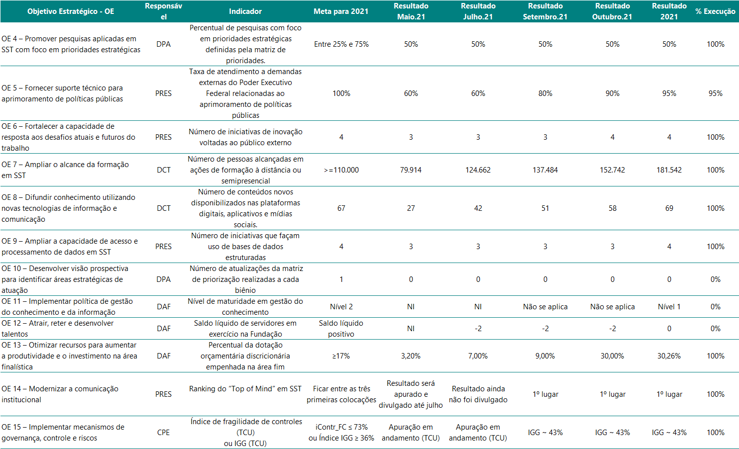 | OE 4 – Promover pesquisas aplicadas em SST com foco em prioridades estratégicas | Percentual de pesquisas com foco em prioridades estratégicas definidas pela matriz de prioridades | Entre 25% e 75% | 50% |
