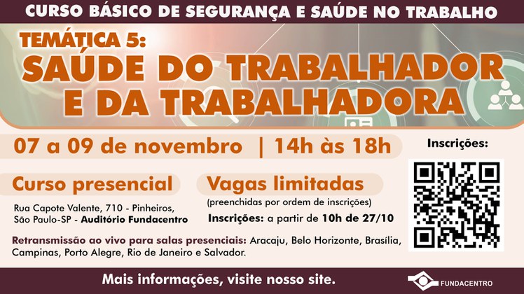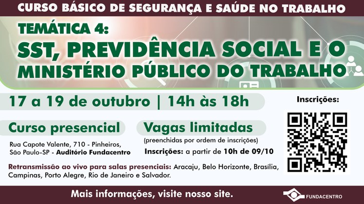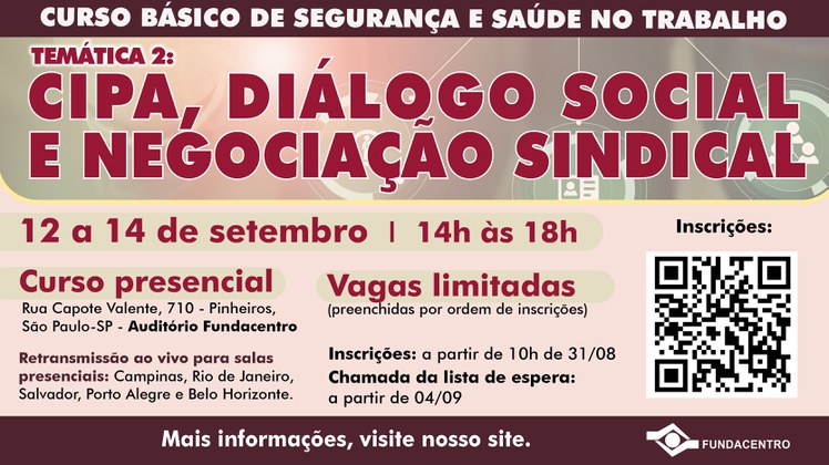 8) Inscrições: poderão ser realizadas até às 12h do dia 21/08/2024, clicando aqui! As confirmações serão realizadas por e-mail, a partir do dia 21/08. Informações maria.felix@fundacentro.gov.br;