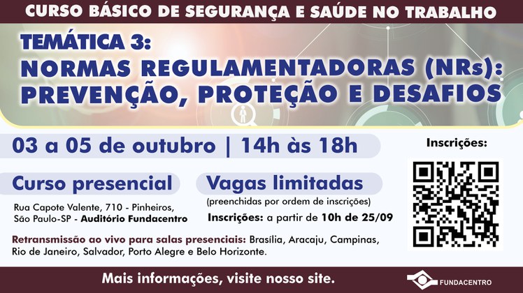 3) Local: Auditório Fundacentro. Rua Capote Valente, 710, Pinheiros, São Paulo - SP;