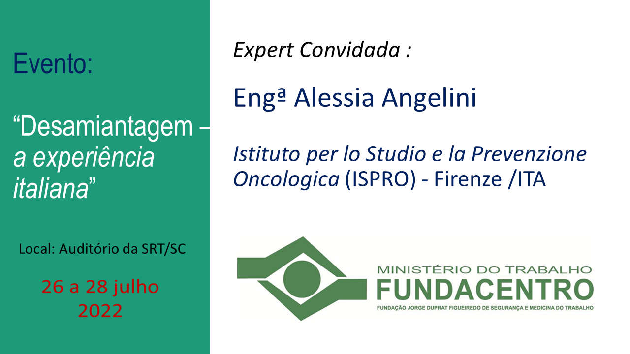 Nos dias 26, 27 e 28 de julho de 2022 ocorreu no Escritório Avançado de Santa Catarina da Fundacentro em Florianópolis o evento "Desamiantagem, a experiência italiana" com a presença da pesquisadora e engenheira italiana Alessia Angelini.