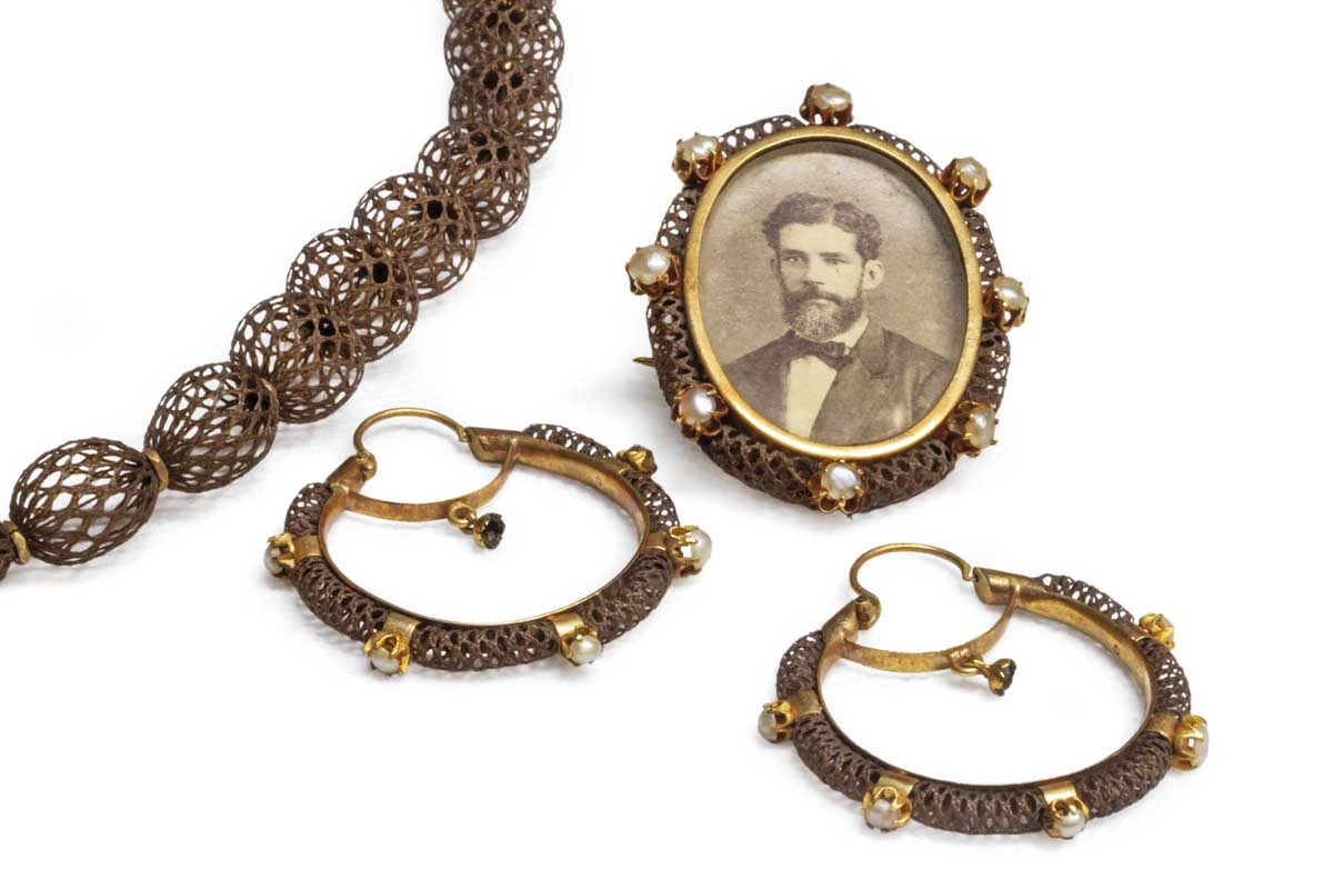 Broche, colar e par de brincos, confeccionados com fios de cabelo e acabamento em ouro e pérolas. Esses objetos eram usados pela Sra. Maria Amélia Matos Pontual, esposa do Sr. Leocádio Alves Pontual, retratado no broche, e antigo proprietário da Usina Aripibu, localizada na cidade de Escada - PE. O conjunto foi doado em julho de 1969, ao antigo Museu do Açúcar, pela Sra. Thereza Pontual Brotherhood, neta de Leocádio e Maria Amélia. Atualmente faz parte do acervo do Museu do Homem do Nordeste.