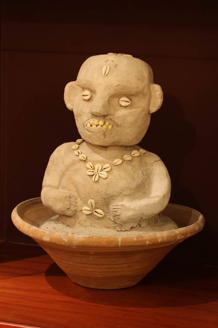 O Assentamento de Exu, em exposição no Museu do Homem do Nordeste, é parte integrante da coleção “Cultura Afro-Brasileira”, concebida sob a curadoria do Babalorixá Manoel Nascimento da Costa, do Terreiro Obá Ogunté ou Sítio de Pai Adão, da tradição Nagô-Egbá do Recife. A peça foi produzida em tabatinga (massapê) e búzios, como manda a tradição. Quanto à energia vital, o Axé sagrado foi feito com obi e orobó (frutos africano), pimenta da costa, pimenta malagueta, otá (pedra), otim (cachaça), êpô (azeite de dendê), oim (mel de abelha).