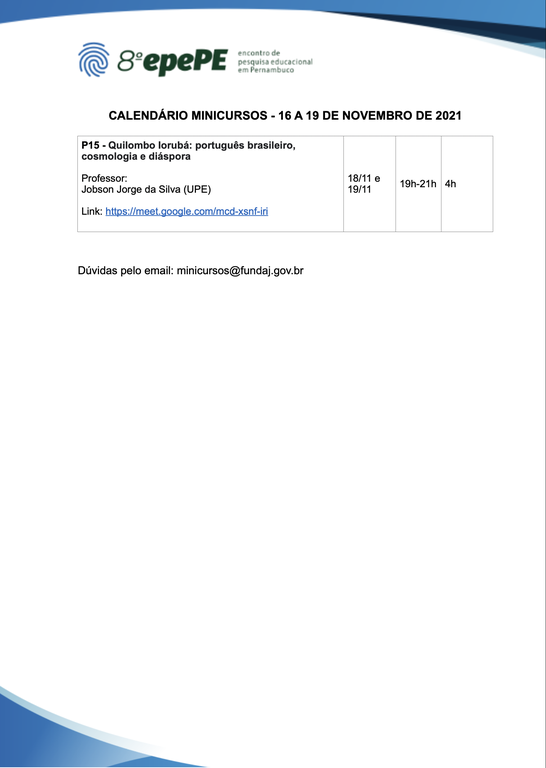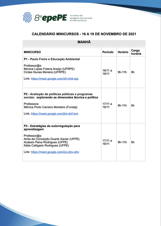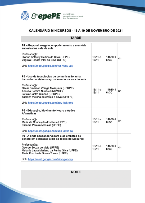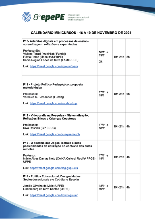 • CALENDÁRIO MINICURSOS - 16 A 19 DE NOVEMBRO DE 2021