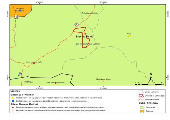 Localização da Estação Ecológica do Seridó, a PNDR (MI, 2003) e a Tipologia das Cidades (MCid, 2005). Fonte: MI, 2003; MCid, 2005. Elaborado pelos autores.