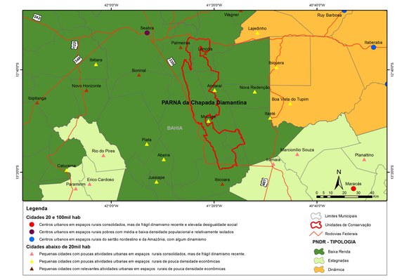 Localização do Parque Nacional da Chapada Diamantina, a PNDR (MI, 2003) e a Tipologia das Cidades (MCid, 2005).