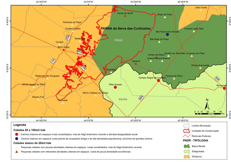 Localização do Parque Nacional da Serra das Confusões, a PNDR (MI, 2003) e a Tipologia das Cidades (MCid, 2005).