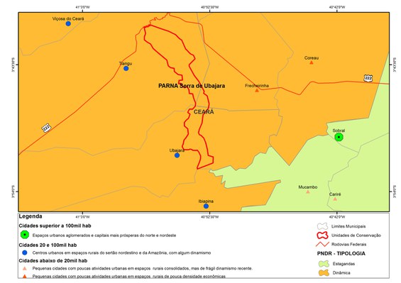 Localização do Parque Nacional Serra de Ubajara, a PNDR (MI, 2003) e a Tipologia das Cidades (MCid, 2005). Fonte: MI, 2003; MCid, 2005. Elaborado pelos autores.