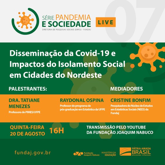 Desde o início da pandemia do novo coronavírus, pesquisas científicas do Brasil e do mundo apontam o distanciamento social como uma medida eficaz no combate à doença. Pensando nisso, a próxima edição da série Pandemia e Sociedade abordará o tema: “Disseminação da COVID-19 e Impactos do Isolamento Social em Cidades do Nordeste”. A Fundação Joaquim Nabuco (Fundaj), por meio de sua Diretoria de Pesquisas Sociais (Dipes) convidou a doutora em Economia, pesquisadora e professora da UFPE, Tatiane Menezes, e o doutor em Estatística, pesquisador e professor da UFPE, Raydonal Ospina, para compor a mesa deste debate. Eles dialogarão sobre o tema, baseando-se em suas pesquisas recentes sobre o assunto. Com mediação da pesquisadora do Núcleo de Estudos em Estatísticas Sociais (NEES) da Fundaj, Cristine Bonfim, o evento virtual acontece no próximo dia 20 de agosto, às 16h, por transmissão de vídeo no canal da Fundaj no YouTube.