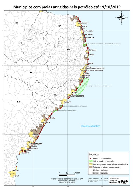 Desde o final de agosto de 2019 diversas praias do Nordeste brasileiro foram atingidas por extensas manchas de petróleo. O fenômeno vem perdurando e em 28/10/2019 o IBAMA, no levantamento parcial computou 92 municípios atingidos em mais de 200 eventualidades (algumas praias atingidas mais de uma vez). Entre estas áreas atingidas, que envolvem todos os estados do Nordeste grandes centros urbanos, importantes polos turísticos e diversas unidades de conservação ambiental estão listados. Isto mostra que estamos lidando com um desastre ambiental de origem industrial sem precedentes na história brasileira, conforme pode ser visto a partir do quadro 1.