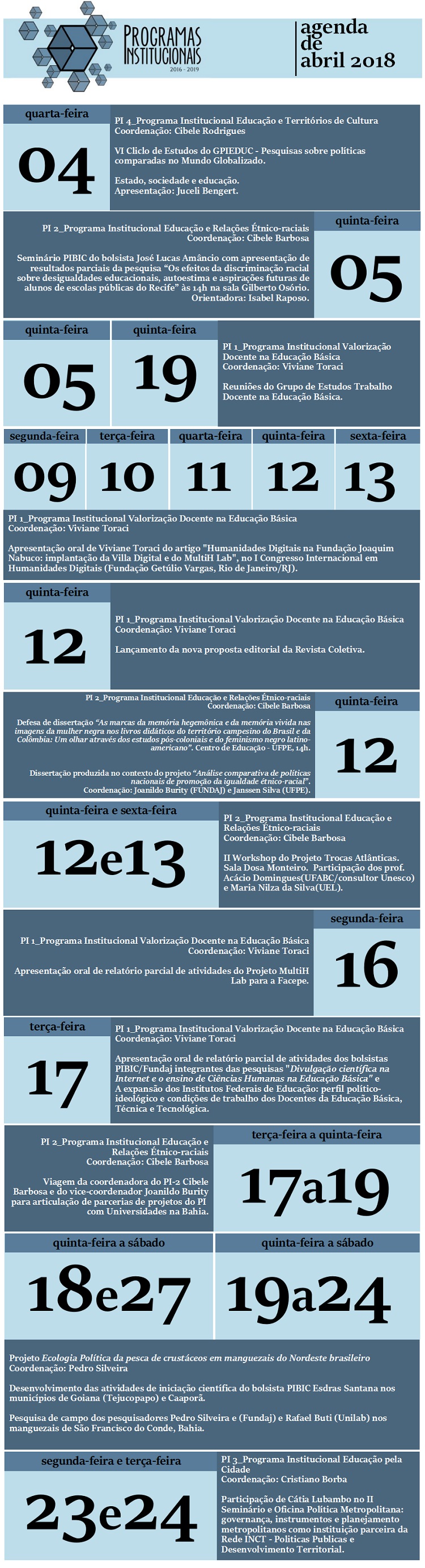 Notícias Agenda de Abril/2018 dos Programas Institucionais Compartilhe: Compartilhe por Facebook Compartilhe por Twitter Compartilhe por LinkedIn Compartilhe por WhatsApp link para Copiar para área de transferência Publicado em 13/06/2018 11h41 Atualizado em 19/10/2021 11h42