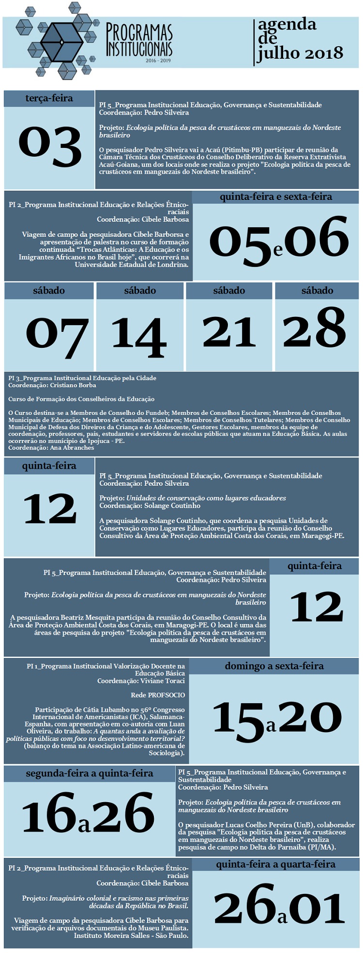 Notícias Agenda de Julho/2018 dos Programas Institucionais Compartilhe: Compartilhe por Facebook Compartilhe por Twitter Compartilhe por LinkedIn Compartilhe por WhatsApp link para Copiar para área de transferência Publicado em 05/07/2018 16h03 Atualizado em 19/10/2021 11h47