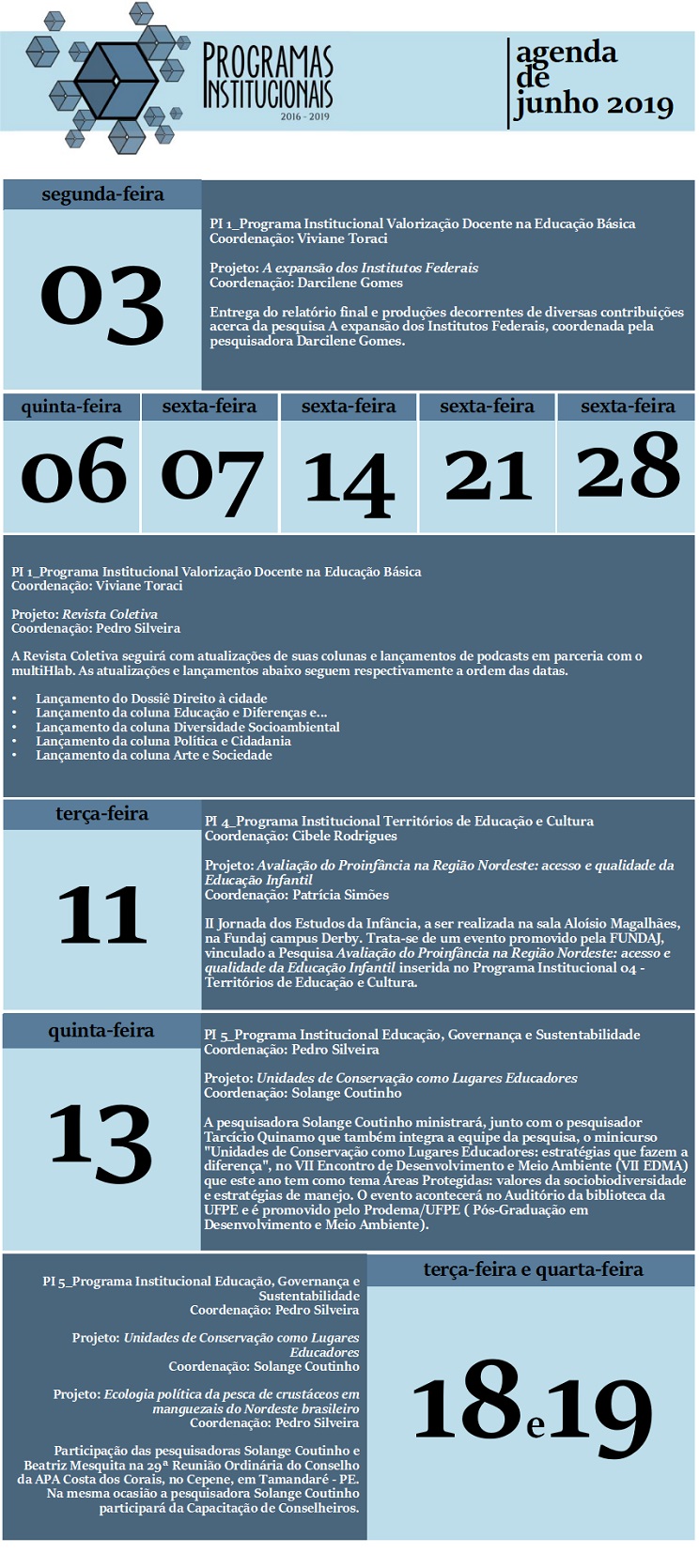 Notícias Agenda de Junho/2019 dos Programas Institucionais Compartilhe: Compartilhe por Facebook Compartilhe por Twitter Compartilhe por LinkedIn Compartilhe por WhatsApp link para Copiar para área de transferência Publicado em 04/09/2019 15h56 Atualizado em 19/10/2021 12h06