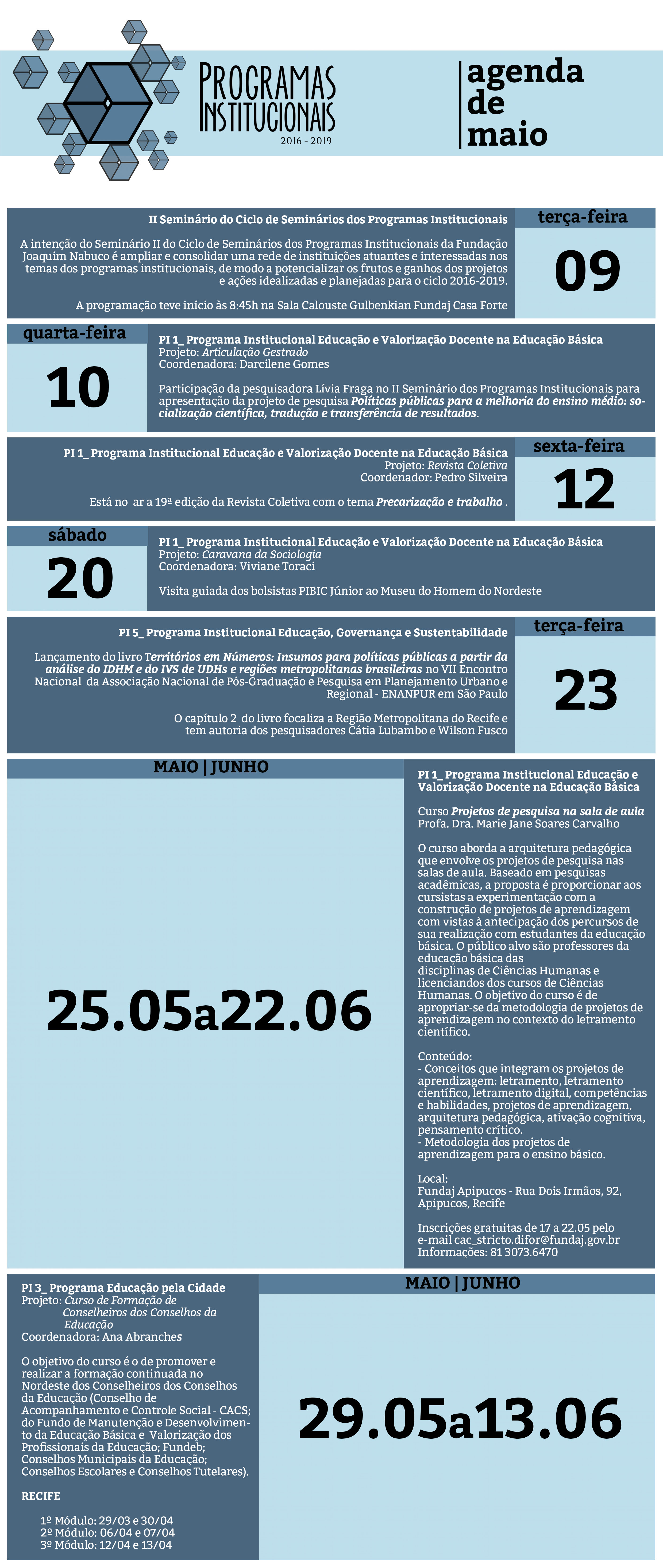 Notícias Agenda de Maio/2017 dos Programas Institucionais Compartilhe: Compartilhe por Facebook Compartilhe por Twitter Compartilhe por LinkedIn Compartilhe por WhatsApp link para Copiar para área de transferência Publicado em 20/06/2017 11h25 Atualizado em 19/10/2021 11h29