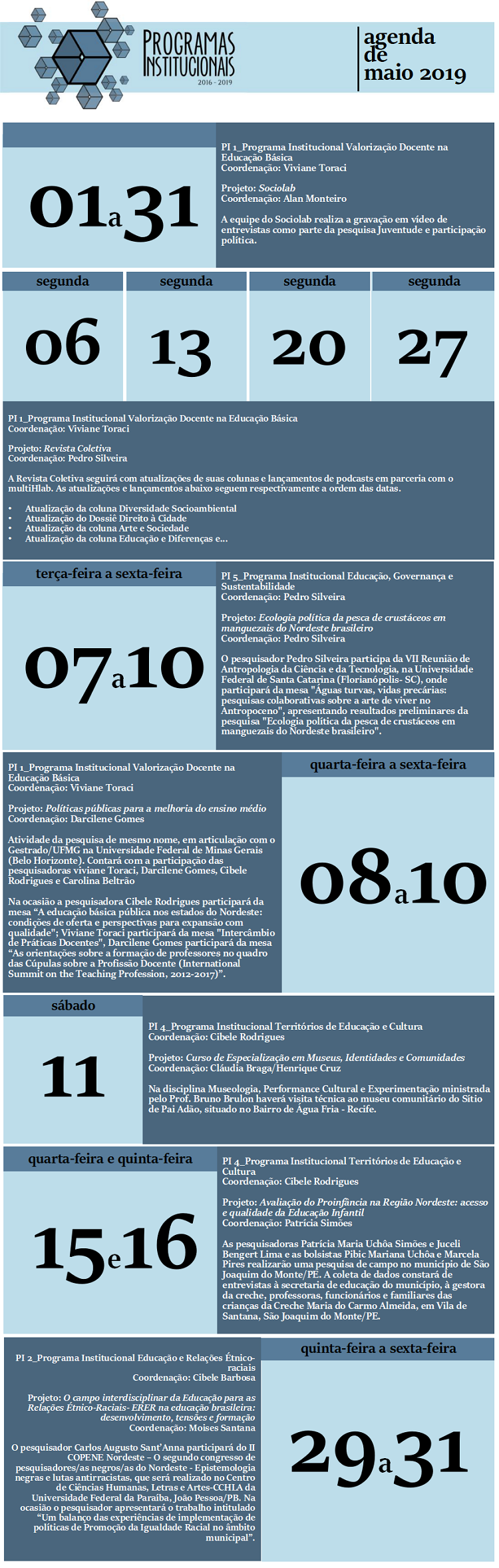 Notícias Agenda de Maio/2019 dos Programas Institucionais Compartilhe: Compartilhe por Facebook Compartilhe por Twitter Compartilhe por LinkedIn Compartilhe por WhatsApp link para Copiar para área de transferência Publicado em 04/09/2019 15h55 Atualizado em 19/10/2021 12h04