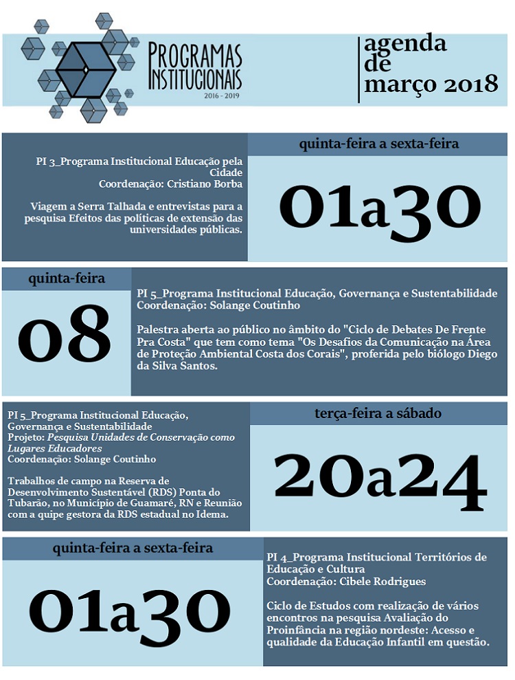 Notícias Agenda de Março/2018 dos Programas Institucionais Compartilhe: Compartilhe por Facebook Compartilhe por Twitter Compartilhe por LinkedIn Compartilhe por WhatsApp link para Copiar para área de transferência Publicado em 13/06/2018 11h28 Atualizado em 19/10/2021 11h40