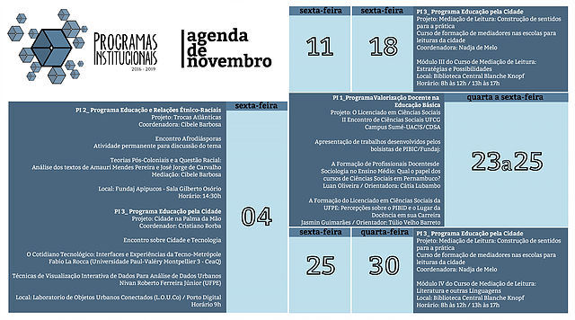 Notícias Agenda de Novembro/2016 dos Programas Institucionais Compartilhe: Compartilhe por Facebook Compartilhe por Twitter Compartilhe por LinkedIn Compartilhe por WhatsApp link para Copiar para área de transferência Publicado em 15/03/2017 10h48 Atualizado em 19/10/2021 11h17