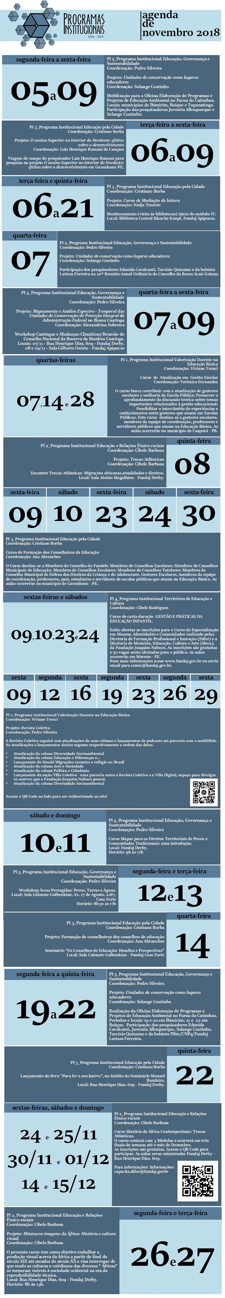 Notícias Agenda de Novembro/2018 dos Programas Institucionais Compartilhe: Compartilhe por Facebook Compartilhe por Twitter Compartilhe por LinkedIn Compartilhe por WhatsApp link para Copiar para área de transferência Publicado em 13/11/2018 16h54 Atualizado em 19/10/2021 11h54