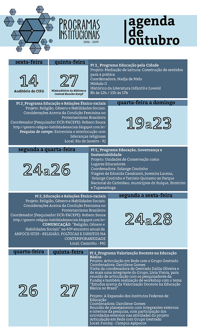 Notícias Agenda de Outubro/2016 dos Programas Institucionais Compartilhe: Compartilhe por Facebook Compartilhe por Twitter Compartilhe por LinkedIn Compartilhe por WhatsApp link para Copiar para área de transferência Publicado em 15/03/2017 10h42 Atualizado em 19/10/2021 10h56