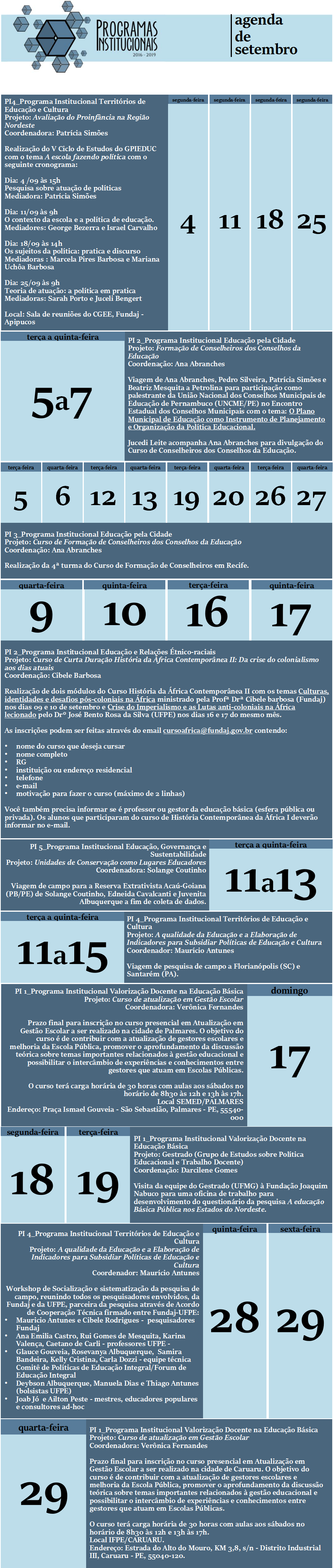 Notícias Agenda de Setembro/2017 dos Programas Institucionais Compartilhe: Compartilhe por Facebook Compartilhe por Twitter Compartilhe por LinkedIn Compartilhe por WhatsApp link para Copiar para área de transferência Publicado em 04/09/2017 16h05 Atualizado em 19/10/2021 11h38