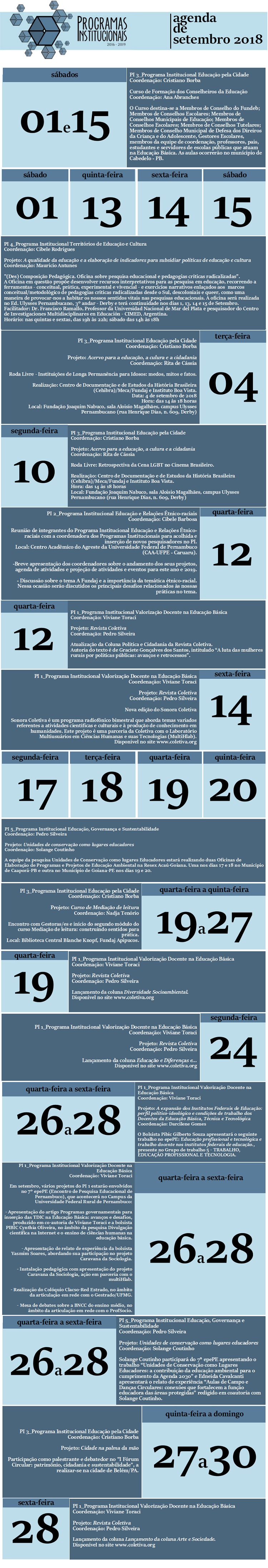 Notícias Agenda de Setembro/2018 dos Programas Institucionais Compartilhe: Compartilhe por Facebook Compartilhe por Twitter Compartilhe por LinkedIn Compartilhe por WhatsApp link para Copiar para área de transferência Publicado em 11/09/2018 15h34 Atualizado em 19/10/2021 11h50