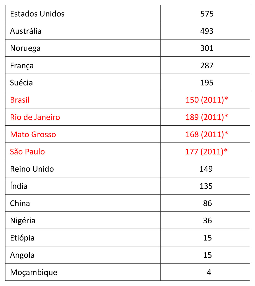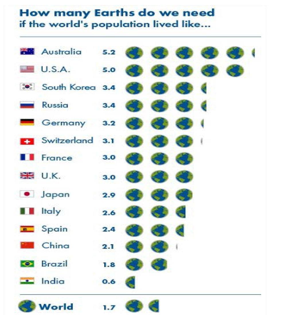 Para mantermos o padrão de consumo extremamente desigual de nossas sociedades, seria já necessário, hoje, um planeta 70% maior que o nosso, medido em hectares globais, sendo que o pobre Brasil, dada a brutal concentração de patrimônio e de renda aqui imperante, já está acima dessa média, como mostra a Figura 2