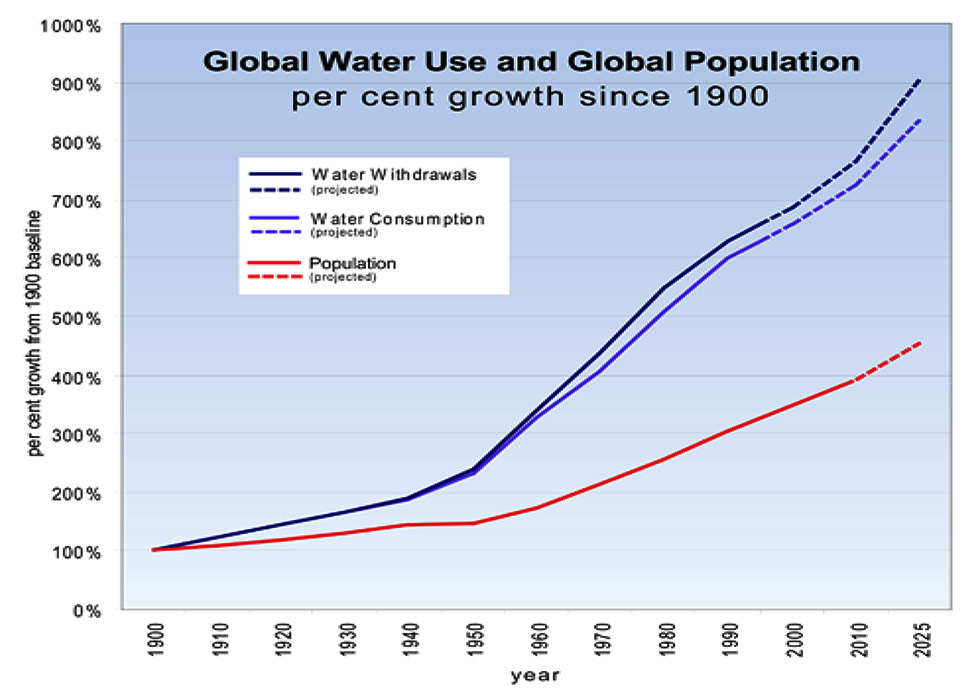 Nesse contexto, a escassez, o consumo insustentável de água e sua poluição aparecem sempre mais consensualmente como o mais grave de todos os consumos degradantes e excedentes da biocapacidade do planeta. Antes de mais nada por causa do aumento do consumo de água, sobretudo pela agricultura irrigada e pelo carnivorismo, a taxas muito superiores às do aumento da população, como mostra a Figura 3.