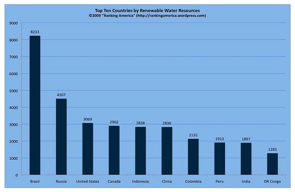 Sob esse aspecto, o Brasil parece um país privilegiado. Detentor de 12% das reservas de água doce do mundo, conforme dados da Agência Nacional de Águas, ele lidera a lista dos dez países com mais recursos hídricos renováveis, segundo o gráfico da Figura 5.