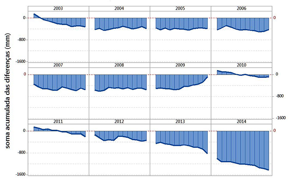 intitulado “Atirei o pau no gráfico”. Com dados fornecidos pela Sabesp e por Miguel Peixe, ele mostra na Figura 7 os superávits e déficits acumulados de chuva entre 2003 e 2014 em relação à média histórica mensal.