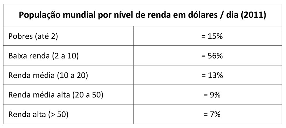 US$ 20,00 por dia, como mostra o Pew Research Center, que assim classifica os cinco níveis de renda da população mundial (2011):