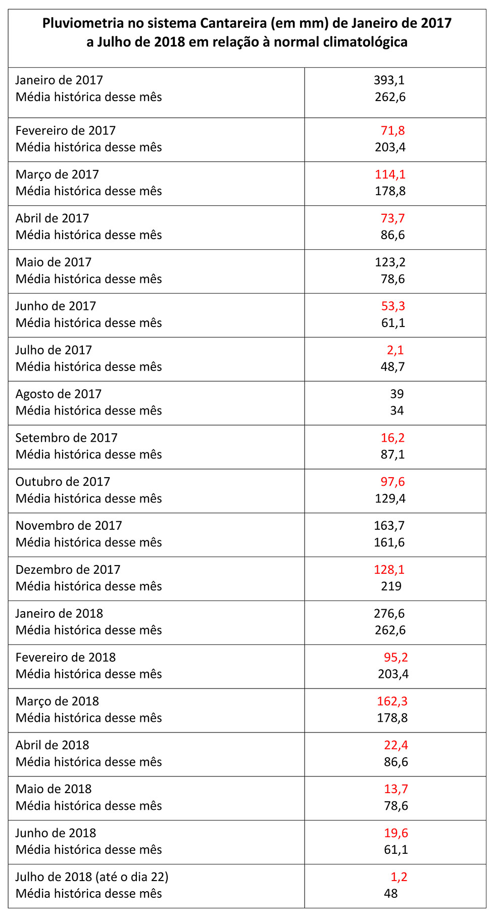 Em apenas dois dos últimos 19 meses (janeiro de 2017 a julho de 2018) a pluviometria sobre o sistema Cantareira foi maior que a média histórica do mês correspondente: janeiro e maio de 2017. Nesse total de 19 meses, em outros três meses a pluviometria ficou apenas minimamente acima da média: agosto e novembro de 2017 e janeiro de 2018. Nos demais 14 desse total de 19 meses, a pluviometria ficou abaixo ou