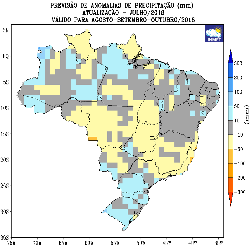 O mapa de anomalias de precipitação do Inmet (Instituto Nacional de Meteorologia) para o trimestre (agosto, setembro e outubro), mostra a tendência de chuvas dentro da normalidade a ligeiramente abaixo do normal em grande parte do Centro-Oeste, acompanhado de temperaturas médias acima do normal climatológica.