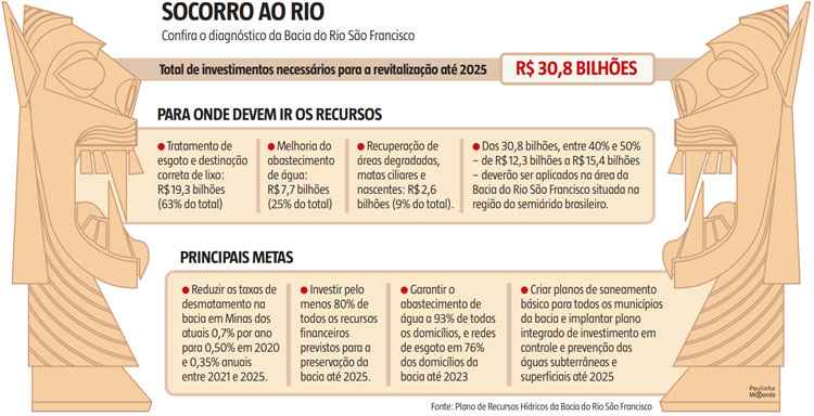 Evitar que o esgoto não tratado e lixo continuem chegando ao Rio São Francisco é uma tarefa árdua, cara, mas que exige execução imediata. Para que a barreira à sujeira vire realidade, serão necessários R$ 19,3 bilhões até 2025, 63% dos investimentos previstos no Plano de Recursos Hídricos da Bacia do São Francisco (PRH-SF) para o período. A ideia é que o dinheiro seja direcionado para esgotamento sanitário, tratamento de resíduos sólidos e drenagem urbana.