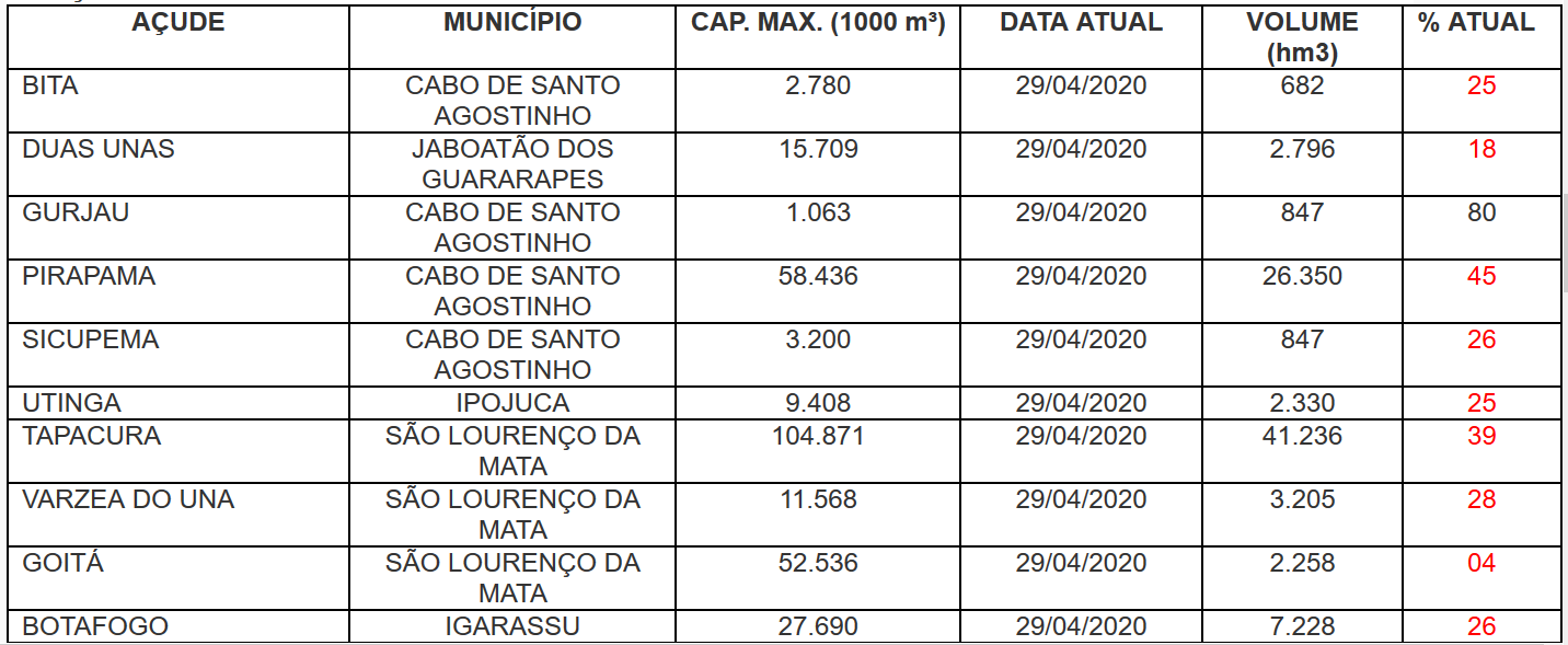 Situação volumétrica dos reservatórios que abastecem o Grande Recife – 01/05/2020