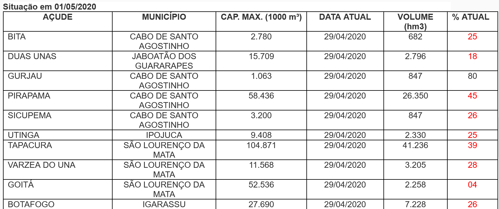 Situação volumétrica dos reservatórios que abastecem o Grande Recife – 08/05/2020