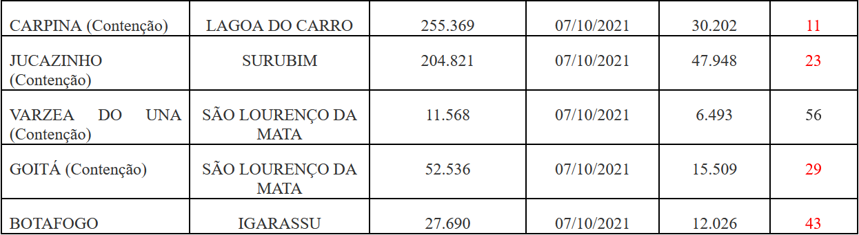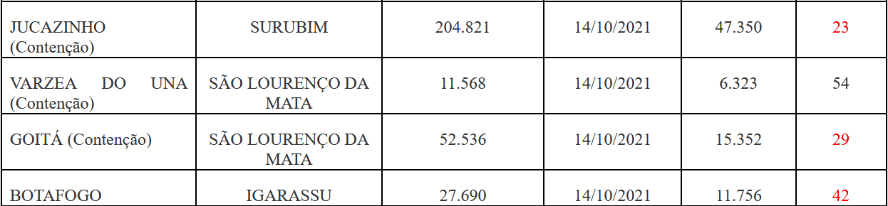 Situação volumétrica dos reservatórios que abastecem o Grande Recife – 15/10/2021