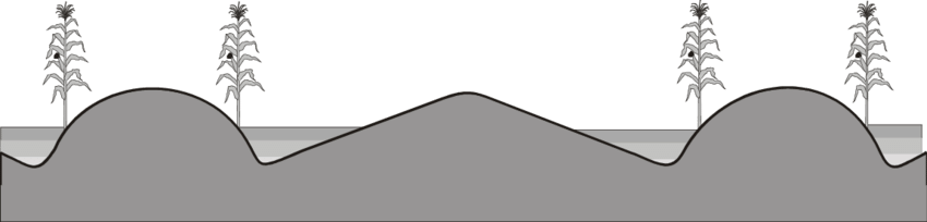 O primeiro plano é formado pelo borda do próprio sulco e serve de área de plantio (Ap); o segundo plano, mais extenso, une a parte mais alta do primeiro sulco à parte mais baixa do segundo, formando a área de captação (Figura 7). Outra variante do sistema de captação de água de chuva in situ adaptado pelo CPATSA é o “Método Guimarães Duque”, que consiste na formação de sulcos igualmente espaçados de 1,5 m. O sistema que o CPATSA denominou de método em W é formado por camalhões largos e estreitos, alternados em curvas de nível. Neste sistema, os camalhões largos servem como área de captação e os estreitos como área de plantio, sendo que os sulcos entre os camalhões funcionam como área de armazenamento. A relação entre área de captação e de plantio é de 2:1, significando que, para cada área de plantio, existem duas unidades de área de captação (PORTO et al., 1990, p. 55). A preparação do solo para captação de água de chuva in situ pode ser feita tanto com trator de pneu como de tração animal, através da utilização de policultores.