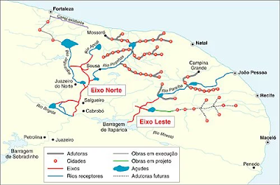 A Transposição do Rio São Francisco foi projetada com dois eixos, o Norte (402Km) e o Leste (220Km), para conduzir as águas do rio para o atendimento das demandas hídricas da região Setentrional nordestina. Foram previstas vazões de 99 m³/s para o Eixo Norte e de 28 m³/s para o Eixo Leste, totalizando 127 m³/s para o projeto.